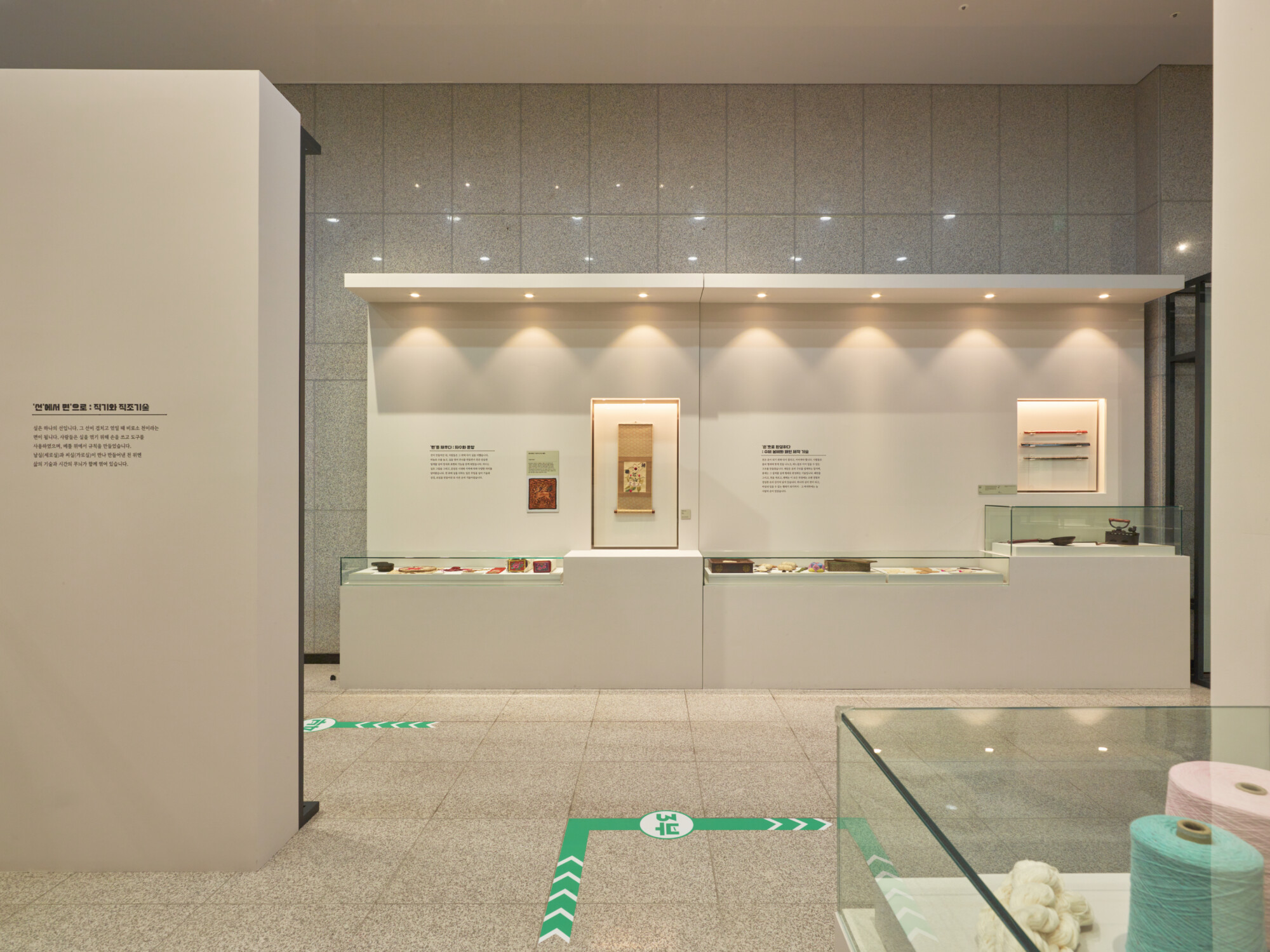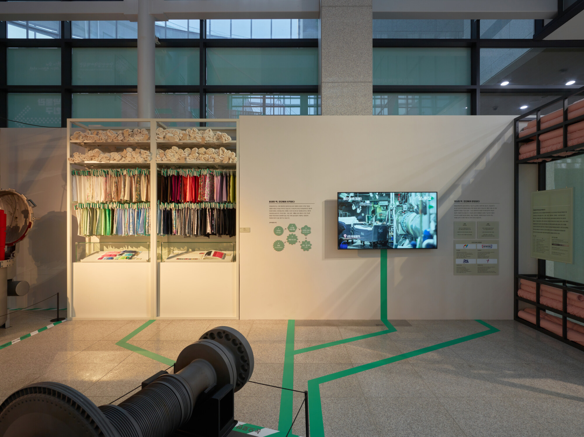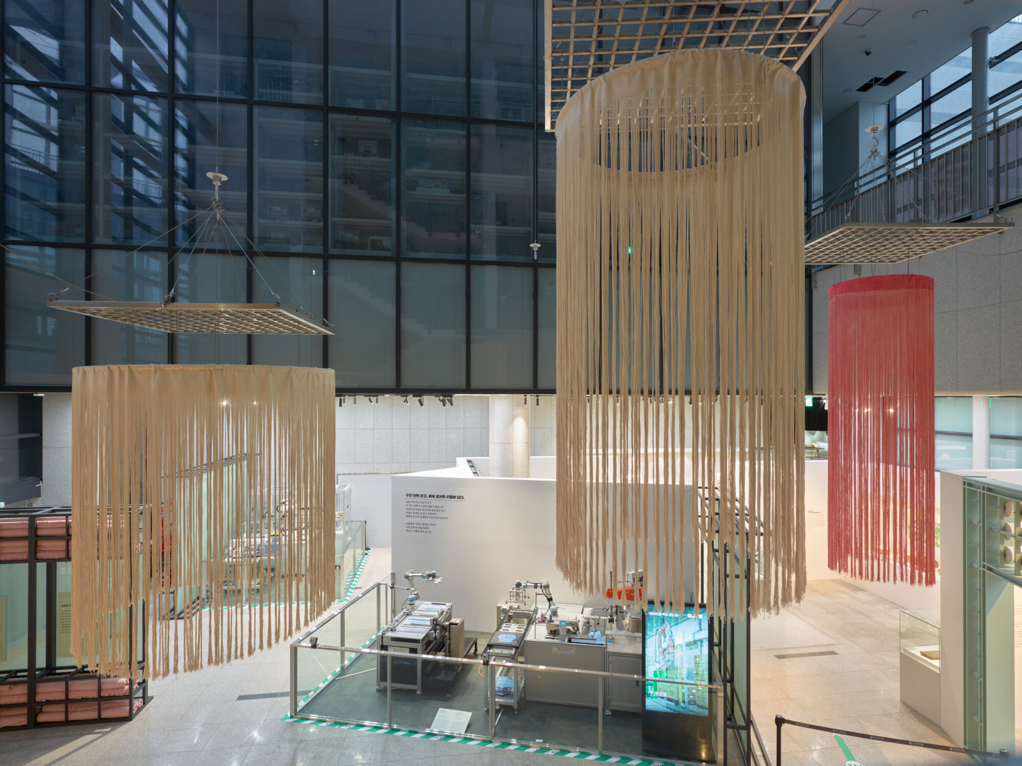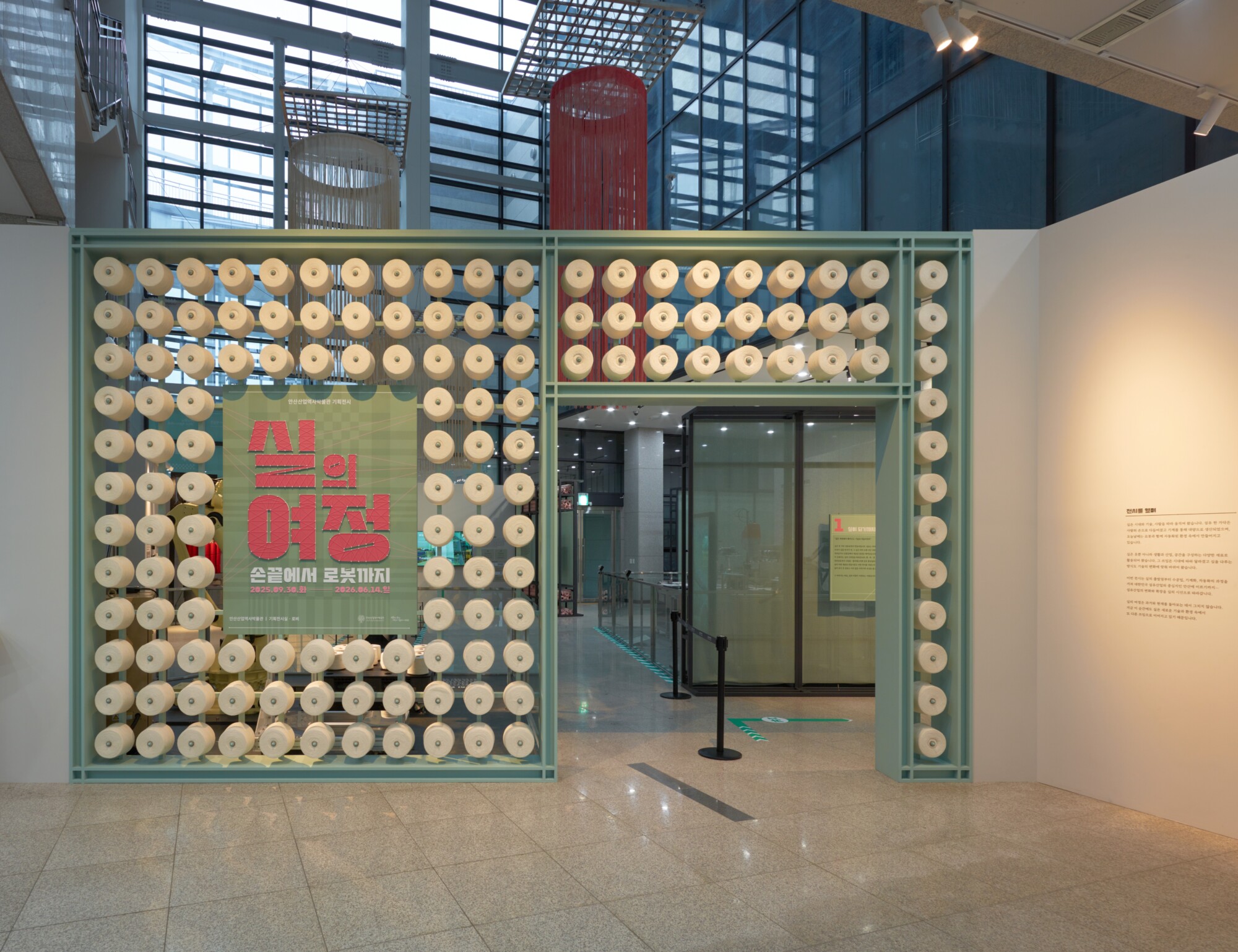실을 전시 스토리텔링의 매개체로 활용하여 섬유 산업의 변천사를 서사적으로 경험할 수 있도록 전시 공간 구현, 높은 천고를 지닌 박물관 로비 특성을 감안한 스트링 아트 설치로 전시 공간의 특성을 반영한 전시 연출