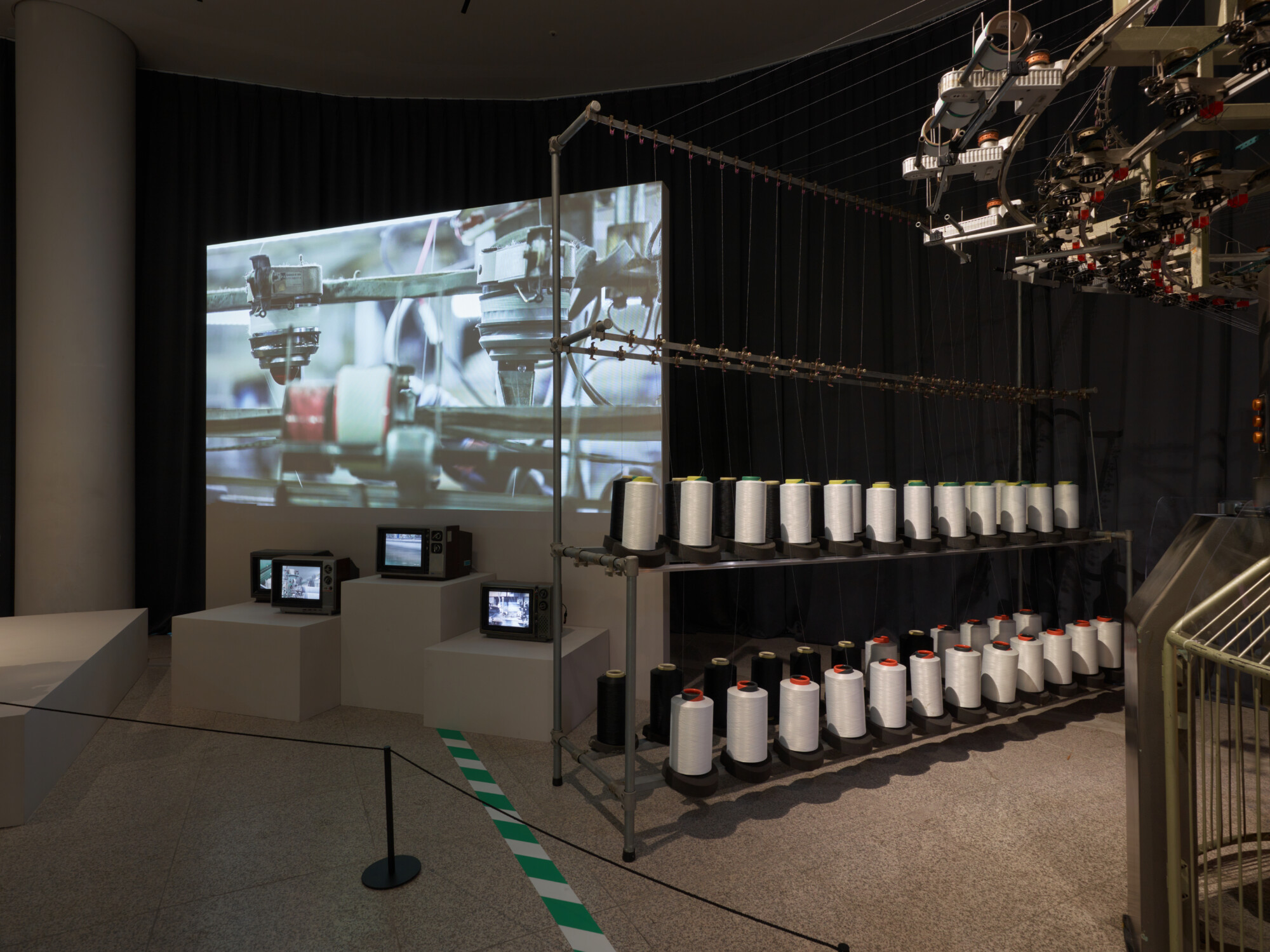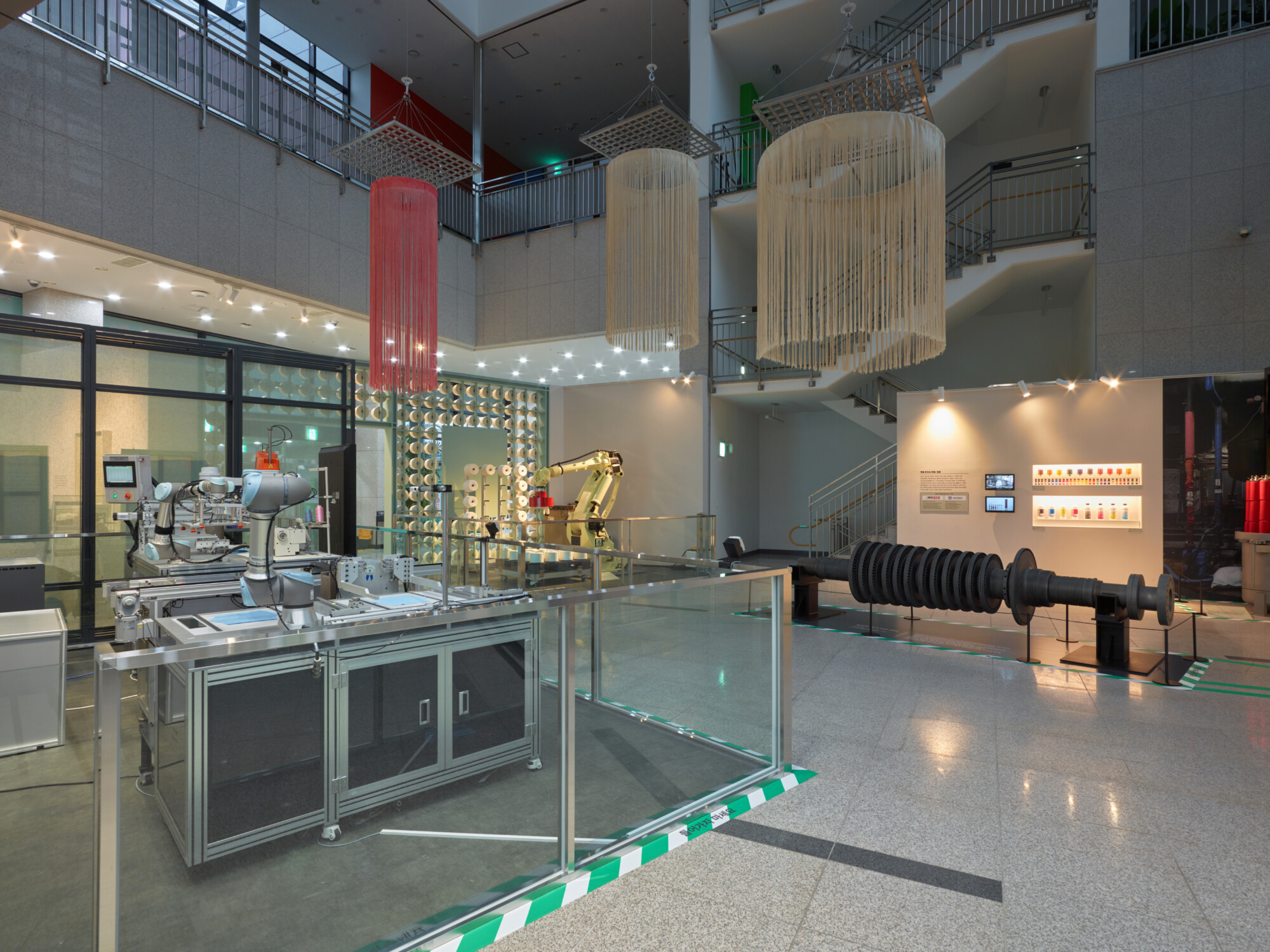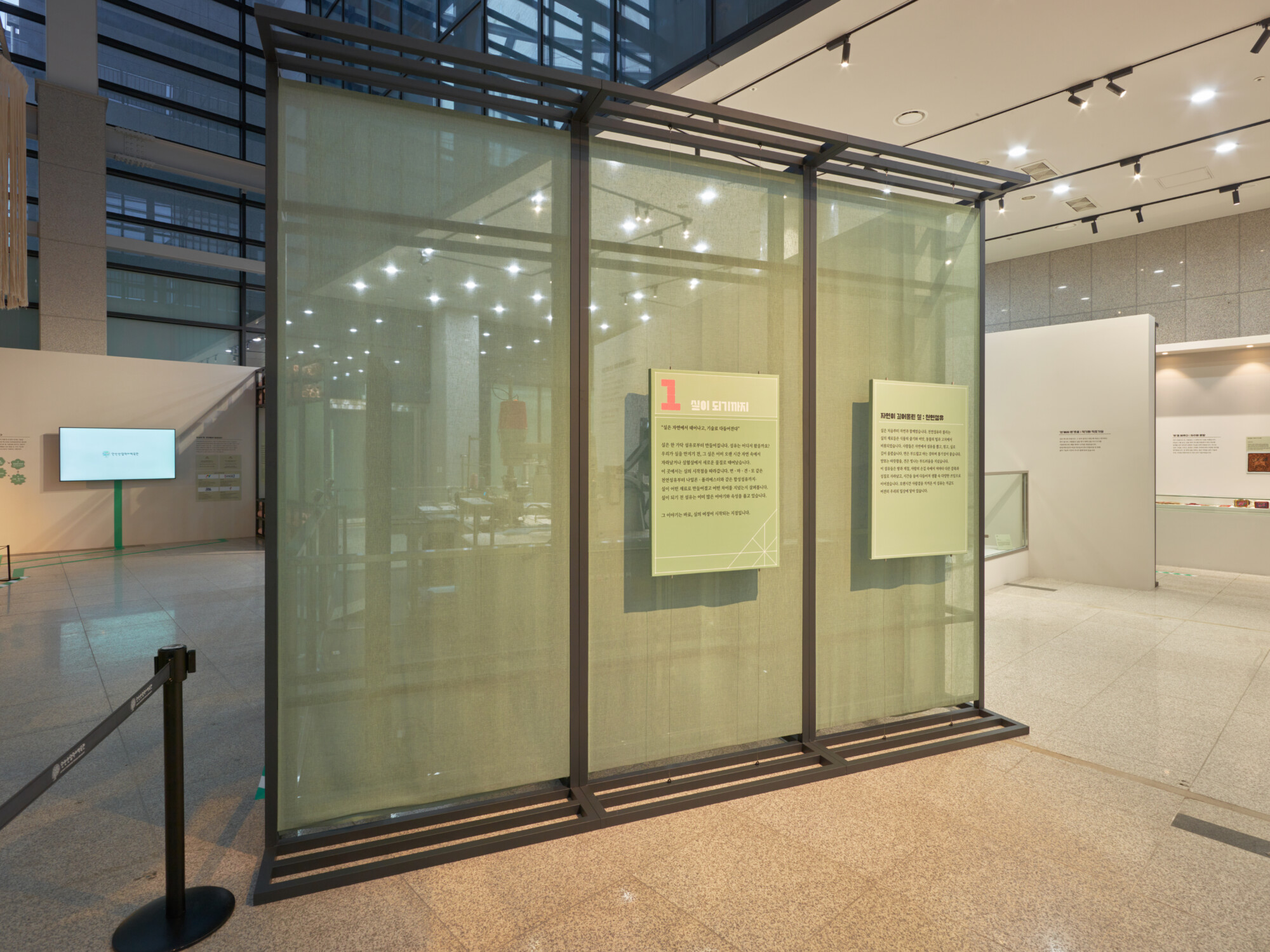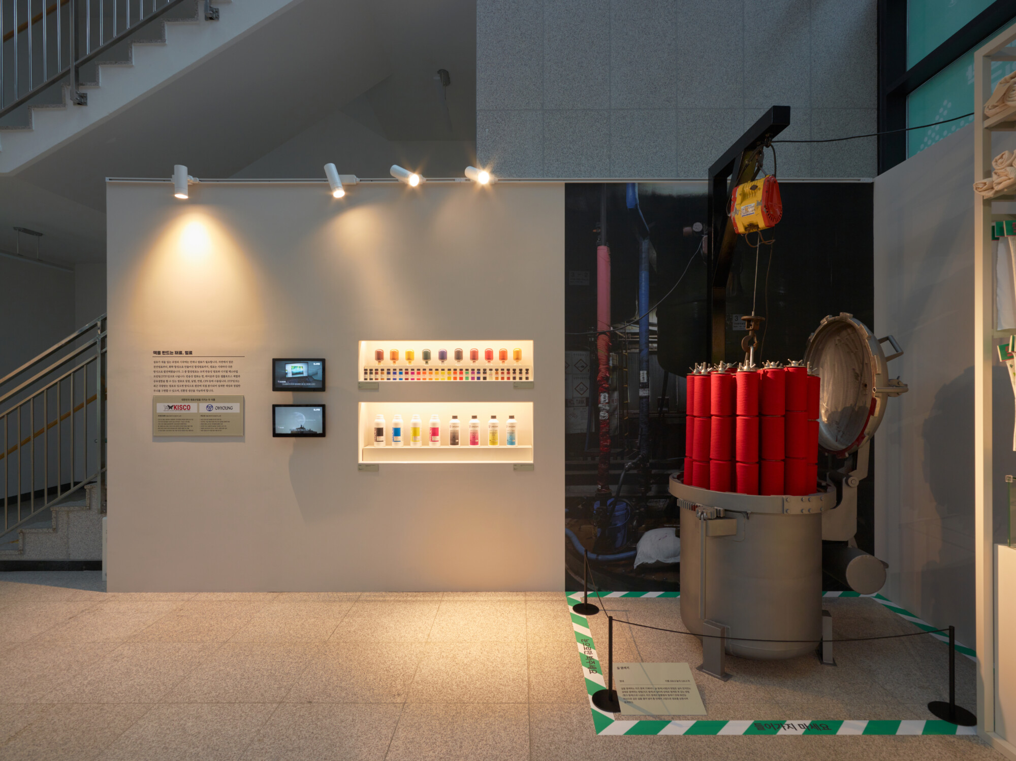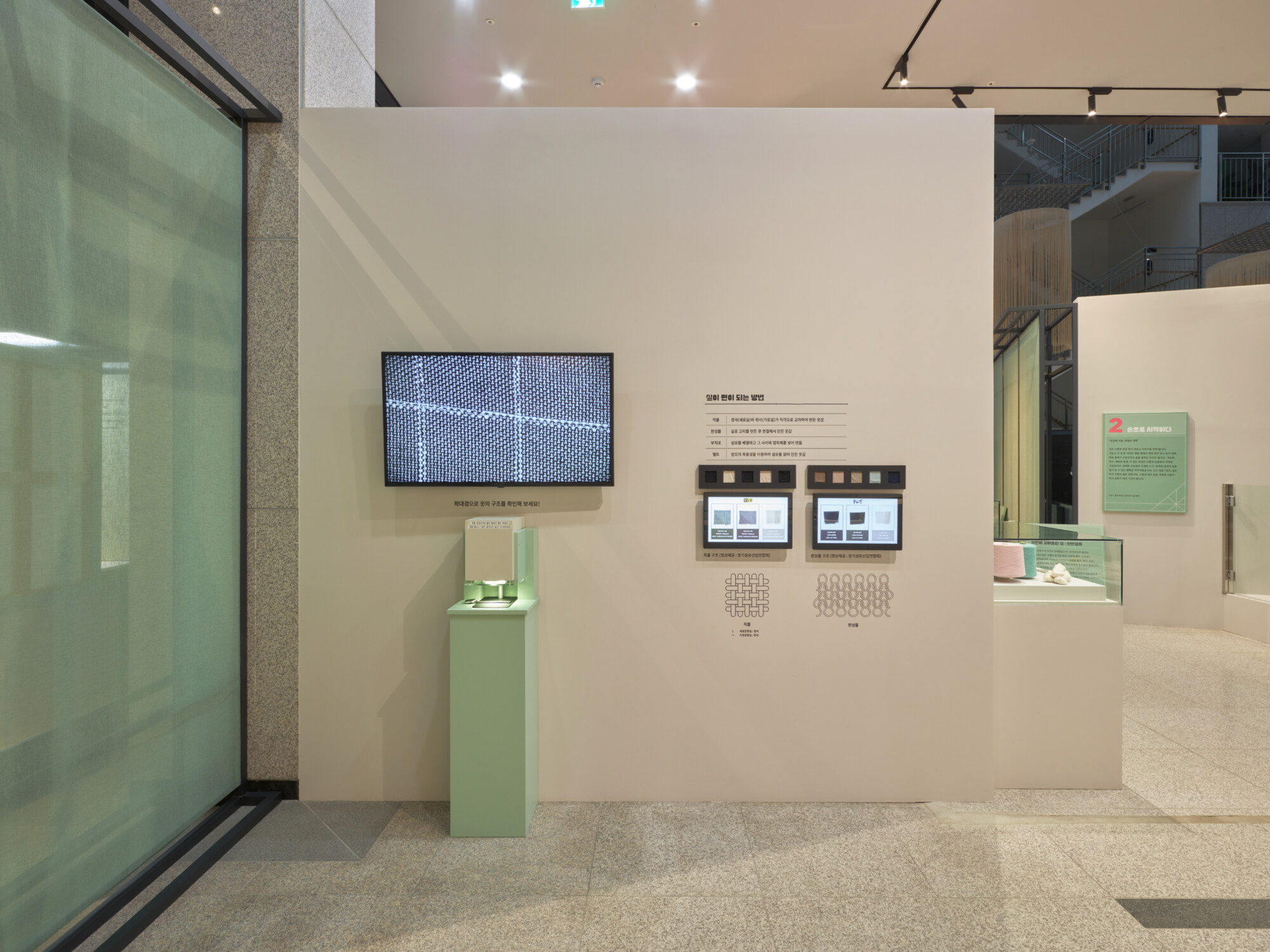 실을 전시 스토리텔링의 매개체로 활용하여 섬유 산업의 변천사를 서사적으로 경험할 수 있도록 전시 공간 구현, 높은 천고를 지닌 박물관 로비 특성을 감안한 스트링 아트 설치로 전시 공간의 특성을 반영한 전시 연출