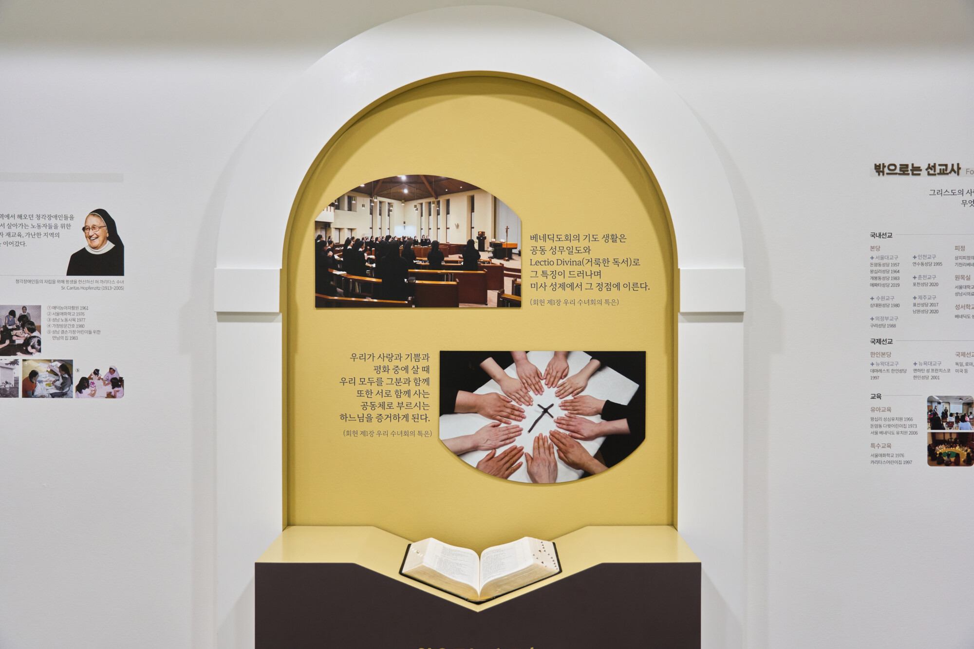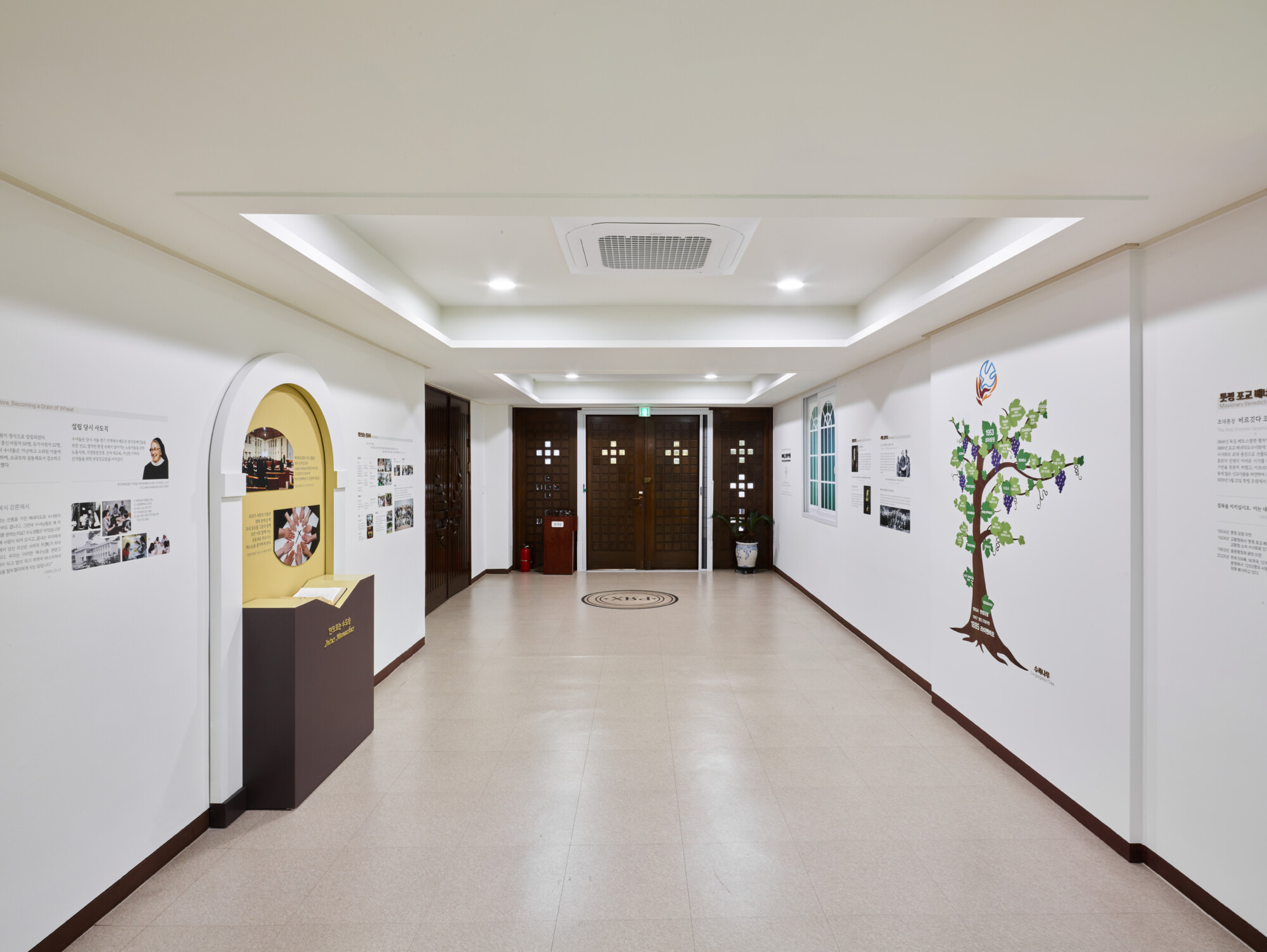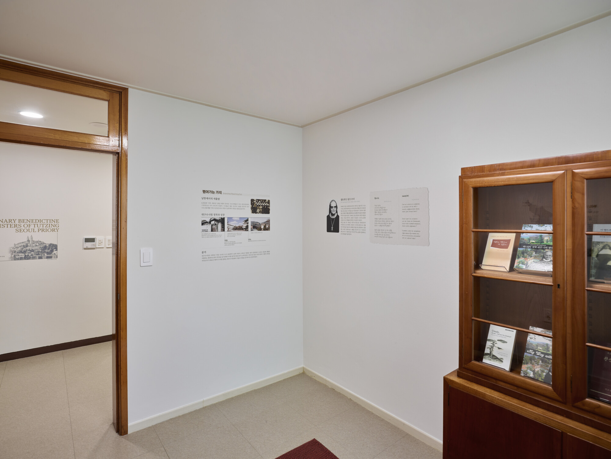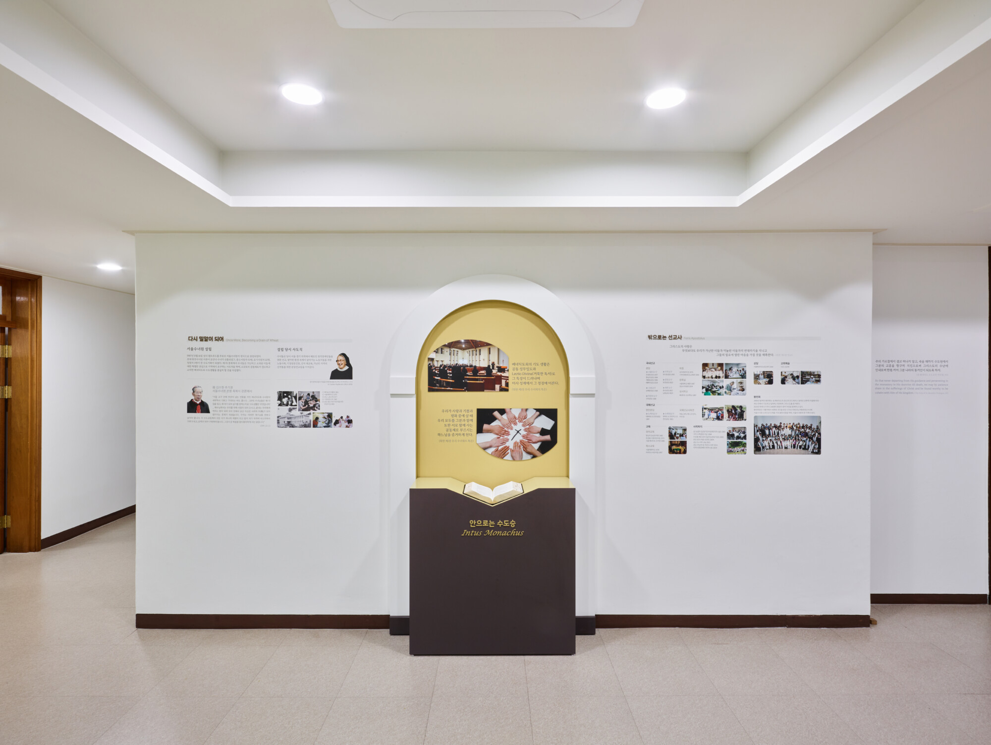 툿찡 포교베네딕도 수녀회 서울 수녀원 상설전시 《100년, 은총의 여정 》 ExhibitionFurnitureGraphicPermanent Works/Exhibitions 날짜 2025.10.31 장소 서울 Seoul, Republic of Korea 클라이언트 툿찡 포교베네딕도 수녀회 서울 수녀원 툿찡 포교 베네딕도 수녀회 서울 수녀원의 역사와 정체성을 담아낸 '100년, 은총의 여정' 상설전시 공간 구축, 수녀원의 벽면과 객실을 활용해 수녀회의 역사적 서사를 따라갈 수 있도록 구현하였으며 그래픽 연출에 월 프린팅 기법을 적용하여 생활 공간이자 전시 공간인 공간적 특성을 섬세하게 반영